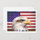 Une carte postale représentant un aigle beau et fort devant un drapeau classique des États-Unis.