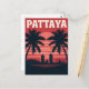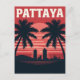 Capture the vibrant nightlife and beautiful coastline of Pattaya, Thailand, with this dynamic retro travel postcard. The design features the city's modern skyline silhouetted against a dramatic red and orange sunset, framed by classic tropical palm trees. This artwork perfectly conveys the lively, resort atmosphere of this famous Southeast Asian destination, making it a great souvenir or piece of bold, vintage art.