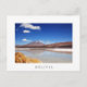 Carte postale d'un paysage avec un volcan enneigé réfléchi dans un lac et une herbe jaune dans le désert d'Atacama près d'Uyuni à la frontière entre la Bolivie et le Chili à l'altitude de l'Altiplano dans les montagnes andines avec une frontière blanche et le texte : 'Bolivie'.