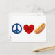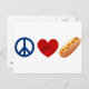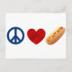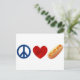 Paix, Amour, Hot Dog avec un signe de paix, coeur rouge et un Francfort à la moutarde.
