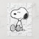 Cette oeuvre Peanuts présente Snoopy assise sur l'arrière - plan de bandes dessinées Charles M. Schulz en noir et blanc.