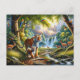 Une scène boisée pleine de vie et de verdure remplie d'animaux sauvages et de beauté sereine. A gauche, un majestueux tigre mène son petit le long d'un chemin orné de feuilles tombés. Dans l'arrière - plan, un groupe de cerfs gracieux se tient au milieu des arbres, l'un levant la tête vers la lumière du soleil filtrant à travers le feuillage. Une superbe cascade descend des rochers, formant une rivière douce qui serpente à travers le paysage. Les oiseaux de différentes teintes perchent sur les branches et volent au-dessus, ajoutant des éclats de couleur à l'ensemble enchanteur. Le ciel passe des teintes dorées chaudes au bleu profond, éclairant toute la scène avec une lueur magique.