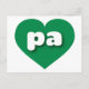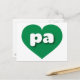 Cette carte postale est dotée d'un coeur vert vif contenant les lettres coques inférieures blanches, arrondies et audacieuses pa, une version ludique de l'abréviation de Pennsylvanie, l'état de la clé. Le verso de la carte postale est vide, en attendant votre texte personnalisé ou vos sentiments manuscrits.
