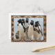 Six Penguins Marcher le long de l'océan sur la plage de sable. Avec un gros rocher et le beau ciel bleu bébé. Cette carte postale a un cadre marron abstrait.