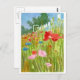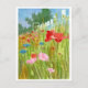 Une jolie carte postale avec une aquarelle fleurie d'un jardin fleuri de pavot rouge et rose près d'une clôture blanche avec perspective intéressante et arbres verts en arrière - plan.