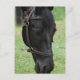 Cheval noir doux broutant dans un champ.