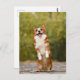 Cette carte postale présente une photo d'un corgi debout sur ses pattes arrières et souriant.