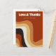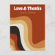 Cette carte postale rétro amusante d'amour et de remerciement présente des lignes ondulées en beige, brun et orange, rappelant les années 70 et le style de vie hippie. Une carte postale de mariage vintage audacieuse avec un script blanc funky à côté des lignes courbes abstraites. Groovez avec cette carte de remerciement amusante de ton de terre.
