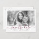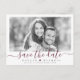 Script moderne "enregistrer la date" en couleur bordeaux, avec photo de couple, simple et élégant. Super photo enregistrer la date des cartes postales pour mariage moderne et d'autres événements. Sélectionnez "Cliquez pour customiser plus loin" dans la section "Personnalisez ce modèle" pour modifier la couleur du script en fonction de votre photo, et ajuster la position de votre photo.