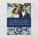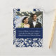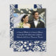 Faire-part Elopement Cartes postales photo en bleu marine foncé et crème blanc motif damassé floral, personnalisable avec vos noms, photo mariage et détails mariages, la façon parfaite d'annoncer que vous avez fui à des amis et la famille. Disponible dans une large gamme de produits mariages correspondants.