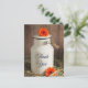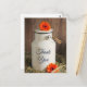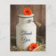 Une carte postale de remerciement avec un design rustique avec un pichet à lait blanc et des fleurs orange posés dans une grange sur du foin.
