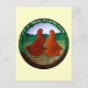 Un Tumbler roux et jaunes grace cette plaque peinte, avec une forêt de vert derrière eux et un treillis les entoure. Ces oiseaux sont des pigeons de luxe populaires en exposition.