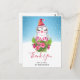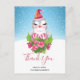 Carte postale Merci au design mignon et fantaisiste, avec un adorable pingouin portant un chapeau de santa rouge. Derrière un bouquet de fleurs aux sucres de canne rayés roses et blancs. Un arrière - plan d'hiver enneigé avec des flocons de neige tombant.