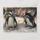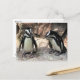 Cette carte postale présente deux adorables pingouins africains debout sur une corniche rocheuse. Ce sont des oiseaux aquatiques sans vol dont les ailes sont devenues des palmes. Chacune a une bande noire et des taches noires sur la poitrine. Le motif de taches est unique pour chaque pingouin, tout comme les empreintes digitales humaines. Ils ont des glandes roses au-dessus des yeux et des pieds roses et noirs.