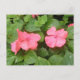 Cette carte postale présente une photo de deux jolies fleurs d'impatiens roses et du feuillage environnant. Les pétales brillent et les feuilles sont mouillés d'une tempête de pluie.
