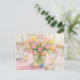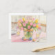 This Easter postcard features a watercolor illustration of a vase of pink tulips as a centerpiece on a holiday table. A lovely postcard for family and friends. You can use it as a holiday greeting or to invite to a gathering – the choice is yours.