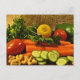 Cette carte postale présente un délicieux plateau en bois de légumes crus frais, notamment des carottes, des tomates, des poivrons, des concombres et du persil. Un citron et des noix de cajou complètent la sélection. Cette nature morte, posée sur un arrière - plan burlap, est un repas gastronomique beau et sain ainsi qu'une composition artistique colorée de rouge, orange, jaune, vert, bronzé et marron.