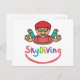 Un design amusant de Skydiving montre un skydiver avec casque, lunettes, pouces vers le haut et les jambes projetées derrière. En tombant dans l'air, en attendant le bon moment pour déployer le parachute. Le mot "Skydiving" sous le "g" se transforme en un grand sourire.