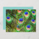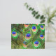 Carte postale présentant un gros plan des magnifiques oeillères scintillantes du train d'un paon, mettant en évidence les détails irisés verts, bleus et bronze de ces plumes de queue. Grande carte pour les amateurs d'oiseaux et de nature. Photo prise à Arcadia, Californie.