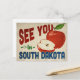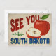 Une charmante carte postale ancienne de voyage du Dakota du Sud représentant une belle pomme rouge, accompagnée d'un texte de style rétro amusant qui dit "À bientôt dans le Dakota du Sud"