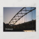 Une silhouette d'un des nombreux ponts de Pittsburgh ; le soleil se couchant derrière, faisant du ciel une couleur bleu violet. Le nom de la ville se trouve dans le coin inférieur gauche d'une police blanche. La photo a été prise sur la rivière Monongahela pendant une soirée d'été.