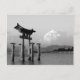 Photographie en noir et blanc de la grande porte torii au sanctuaire d'Itsukushima sur l'île de Miyajima au Japon.