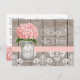 Cette jolie et rustique carte de date changée d'hydrangea rose est parfaite pour la future mariée qui célèbre avec un mariage champêtre ou une fête de douche de mariage à thème fermier. Initialisez le pot mason avec les initiales de la mariée et du marié. Le dos de la carte a un fond d'aspect bois, ruban et motif de dentelle damassée. Conçu par Chrissy H. Studios, LLC. Changez le texte pour dire ce que vous voulez.