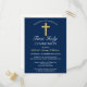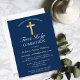 Invitation votre famille et vos amis à la 1ère communion de votre fils avec cette Elégante Croix Bleue de la Marine d'or Première Sainte Communion Carte Postale Invitation. Ce design présente une belle croix dorée simple contre un arrière - plan bleu foncé classique. Personnalisez la couleur et la police et modifiez la date et le texte en fonction de vos besoins. Parfait pour la 1ère communion d'un garçon.