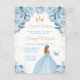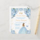 Cette invitation élégante et glamour pour un anniversaire sweet sixteen présente une belle princesse aux cheveux blonds dans une robe de bal bleu clair. Le texte combine une écriture manuscrite et des polices modernes sans serif pour un look classe et sophistiqué. Les arrangements floraux, le papillon et les confettis dorés créent le mélange parfait de rustique et de chic.