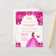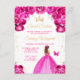 Cette invitation d'anniversaire sweet sixteen élégante et glamour présente une belle princesse aux cheveux bruns dans une robe de bal rose chaud. Le texte combine une écriture manuscrite et des polices modernes sans serif pour un look classe et sophistiqué. Les arrangements floraux, le papillon et les confettis dorés créent le mélange parfait de rustique et de chic.
