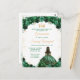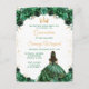 Cette invitation d'anniversaire Quinceañera élégante et glamour présente une belle princesse aux cheveux foncés dans une robe de bal vert foncé. Le texte combine une écriture manuscrite et des polices modernes sans serif pour un look classe et sophistiqué. Les arrangements floraux et les confettis dorés créent le mélange parfait de rustique et de chic.
