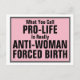 Ce que vous appelez Pro-Life est vraiment anti-femme Naissance forcée Les membres du Congrès nous montrent qui ils sont par leurs votes. Tant de membres du Congrès votent régulièrement contre les droits fondamentaux des femmes, y compris, mais pas uniquement, la santé des femmes. Bien qu'ils prétendent voter pour la moralité, ils savent que les fonds fédéraux n'ont pas été utilisés pour l'avortement depuis des années. Lorsqu'ils prétendent voter pour la vie, ils votent vraiment pour empêcher les femmes d'avoir accès aux examens de dépistage du cancer de l'ovaire, aux examens de santé maternelle et à d'autres soins de santé de base pour la reproduction. Ils déservent les soins de santé des femmes et rendent difficile le choix en matière de reproduction tout en supprimant les programmes d'aide aux mères et aux enfants. Ces votes ne sont pas pro-vie, ils sont anti-femme et la naissance forcée.