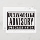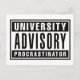 Conseil universitaire, Procrastinator. Voici un avertissement amusant à toutes les universités que vous êtes un procrastinateur. J'ai certainement eu ma part de procrastination pendant l'université. Maintenant, c'est votre chance d'en faire la lumière. J'ai placé ce design sur une variété de produits allant des t-shirts aux tasses. Ceux-ci font de grands cadeaux pour n'importe quel étudiant de l'université.