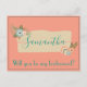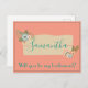 Une belle proposition de demoiselle d'honneur, ce design à thème coquillages a un arrière - plan de couleur pêche. Le nom est écrit en turquoise police cursive sur une belle bannière. "Seras-tu ma demoiselle d'honneur" est écrit en bas. Commandez les vôtres dès aujourd'hui !