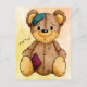 Ours en peluche de poupée d'aquarelle d'aquarelle d'aquarelle orange et jaune avec des taches violettes et bleues, un corps brun et des pieds tans nez et oreilles sur un arrière - plan d'aquarelle orange et jaune. A sa gauche dans un petit texte noir sont les mots Miss You!