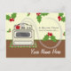 Carte postale avec un arrière - plan de couleur brune avec garniture verte au fond. Illustration d'un poêle beige rétro posé sur un sol rouge et vert festif. Une bouilloire rouge se trouve sur le brûleur avant gauche du poêle. Illustrations saintes au sommet sur arrière - plan beige. Écrivez votre recette sur le dos.