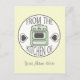 Carte postale recette illustrant un arrière - plan blanc cassé et un cercle blanc au centre. Illustration d'un poêle vert rétro avec un coeur de chaque côté et texte au-dessus et au-dessous qui dit "De la cuisine de" cercle intérieur. Personnalisez avec votre nom en bas. Le côté opposé présente un rectangle blanc avec des bords grises et des angles de photo à l'ancienne à droite. Le texte à l'intérieur du rectangle dit "Recette". Recherchez les articles correspondants chez Jill's Paperie.