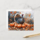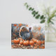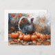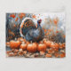 Une aquarelle d'une dinde debout fièrement parmi les feuilles d'automne citrouilles et tombées.