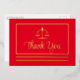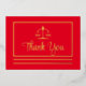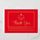 Simple, élégant et moderne remerciement rouge pour la remise des diplômes ou un avocat ou un autre professionnel du droit avec une véritable feuille d'or sur le devant, balance de la justice et texte avec un cadre rectangulaire et doubles lignes en bas et dos texte noir, conception de carte postale avec modèle au dos pour l'adresse de retour. Création originale de Holiday Hearts Designs (tous droits réservés).
