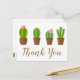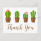 Une illustration moderne de cactus vert et rose constitue ce design de remerciement simple et coloré. Il y a quatre types de cactus épineux dans des pots en terre cuite marron, deux avec de grandes fleurs roses voyantes et deux sans. Qu'est-ce qu'on n'aime pas chez ces belles plantes succulentes brillantes ?