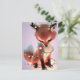 Une carte postale avec un petit bébé renard mignon qui regarde vers le bas avec des lumières féeriques enroulées autour de lui. Une ambiance de Noël douce et sucrée.
