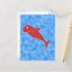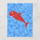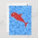 Un dessin animé de requin de couleur rouge sur un fond à motif bleu. Le requin et le motif bleu sont un motif imprimé, ce n'est pas un motif en relief ou texturé.
