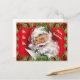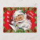 This retro vintage style postcard veut delight children because it is cute. Shown is a jolly Santa Claus oms is holding a candy cane while checks his to see the names of Children who have been naughty or nice.