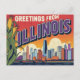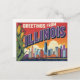 Celebrate the Prairie State with this bold, retro "Greetings from Illinois" postcard! This vintage large-letter design features the iconic Chicago skyline set against a dramatic sky, beautifully contrasted with stalks of corn representing the state's agricultural heritage. This bright, comic-style travel artwork is perfect for Illinois residents, Chicago lovers, urban fans, collectors of Americana, or anyone who appreciates the classic US state souvenir style. A fun, unique piece to send or display.