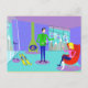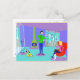 Brr... Cette Carte Postale Rétro Ski Vacation vous fera découvrir un Saint Bernard avec un masque de brandy. Le dessin de dessin animé moderne du milieu du siècle présente un couple glamour tressé dans un chalet de ski coloré avec une vue magnifique. La chambre est dotée d'un sol turquoise et de murs violets. Hé, c'est les années 60 ! Les fenêtres du sol au plafond révèlent des montagnes enneigées, un ciel turquoise avec des nuages bleu clair, et les silhouettes de personnes heureuses qui se baladent dans les gondoles des remonte-pentes. A l'intérieur de la pièce, on voit une cheminée à cônes vert olive avec un feu de cheminée. Jeté sur le sol sont deux skis jaunes à côté des bâtons de ski. Au centre de la pièce, un bel homme aux cheveux noirs porte un pantalon bleu et un pull-overs vert. Il porte un plateau de martinis. Un bras est tendu, offrant un martini à la main d'attente d'une femme blonde. La femme, est assise dans un fauteuil rouge, oeuf. Elle porte un pantalon bleu marine et un pull rose chaud. Veuillez l'excuser de ne pas se lever, mais elle a un coup sur une jambe !