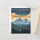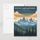 Celebrate the wild beauty of the north with this stunning Rocky Mountains Travel Card. This vintage-style illustration captures the dramatic, sun-drenched peaks of the Canadian range as they rise above a deep valley of towering pine and fir trees under a moody mountain sky.