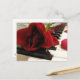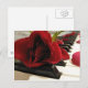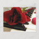 Une rose rouge et des pétales romantiques qui contrastent avec les touches de piano noir et blanc.