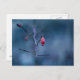 Carte postale avec photo de closeup d'un vieux fruit de rose rouge congelé, sur un arrière - plan de livre bleu. Personnalisable .