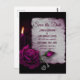 Mariage enregistrer la date carte postale. Conçu dans un style gothique. Un vieux papier parchemin gris avec des touches de rouge violet autour des bords. Un rose magenta en pleine floraison, un rosebud, une bougie et un casier argenté sur un arrière - plan bordeaux foncé crée une belle et mystérieuse carte de datation.