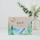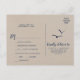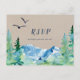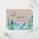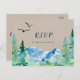 Cette carte postale RSVP kraft Rocky Mountain est idéale pour un mariage extérieur. Le design présente un paysage sauvage peint en bleu et vert avec des pins d'aquarelle, des oiseaux et des montagnes sur un arrière - plan en papier kraft léger. Cette carte postale de réponse mariage demande à la clientèle quel repas elle souhaite à la réception. Veuillez noter que ceci n'est pas imprimé sur du papier kraft réel. C'est un graphisme de haute qualité fait pour ressembler à du papier kraft.